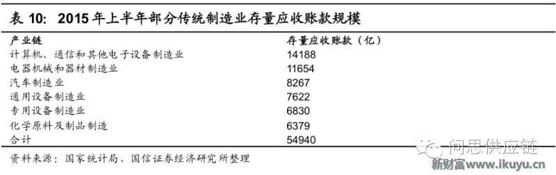 根据国家统计局公布的2015年上半年数据,传统制造业(包括计算机、通信和其他电子设备制造、电器机械和器材制造、汽车制造、通用及专用设备制造等)、材料工业(包括化学原料及制品等)和大宗商品(包括金属及部分非金属制品、煤炭开采和选洗等)是商业保理潜在市场规模最大的产业。