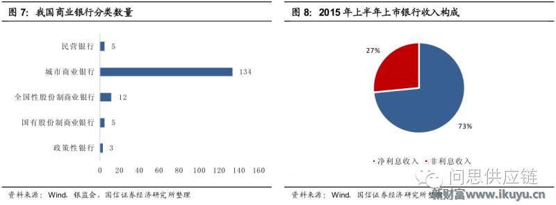 (1)国有资本垄断商业银行,牌照监管限制民营资本进入。除了农村商业银行,我国现在总计有159家商业银行(3家政策性银行+国有5大行+12家股份制银行+134家城商行+5家民营银行),其中由民营资本控股并真正可以行使控制权的仅有有2015年年6月银监会批准正式营业的5。家民营银行。尽管银监会表示将积极引导民营资本进入商业银行业,但是其对牌照的发放和审核还是非常严格(大股东净资产不低于100亿,实际控制人净资产不低于50亿)。这使得我国的商业银行进入壁垒远较欧洲更高,竞争相对较缓和,基础存贷业务即可提供丰厚的收入(2015达年上半年净利息收入占上市银行总收入的比例达73%)),使得商业银行主动提高风险偏好做大保理等扩展业务的意愿不强。
