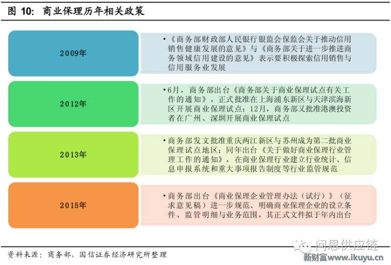 2009年《商务部财政部人民银行银监会保监会关于推动信用销售健康发展的意见》与《商务部关于进一步推进商务领域信用建设的意见》两个文件的出台表露监管层积极探索信用销售与发展信用服务业的决心,成为商业保理试点实践的前奏。2012年,商务部发布《关于商业保理试点有关工作的通知》,商业保理首次获得了政策的肯定与支持,由此告别零星的草根发展阶段迈入规范发展的快车道。此后商务部多次出台相关文件扩大商业保理试点范围,截止2014年,除湖南、甘肃、宁夏、海南与贵州五省外其他省份、直辖市均已开展商业保理试点。