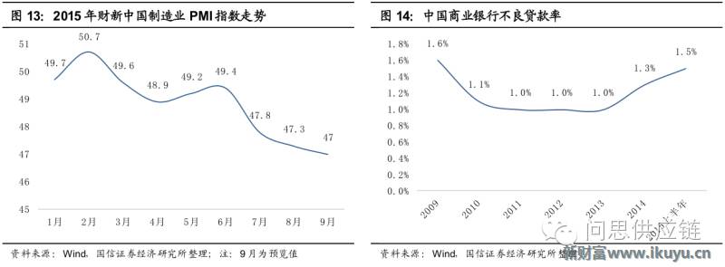 (1)信贷周期:信用收缩周期,中小企业融资日益艰难。随着我国经济增速的减档,消费与投资需求下滑,信贷质量不断下降,表现为制造业PMI指数不断走低并长时间位于荣枯线下以及银行不良贷款率不断走高。