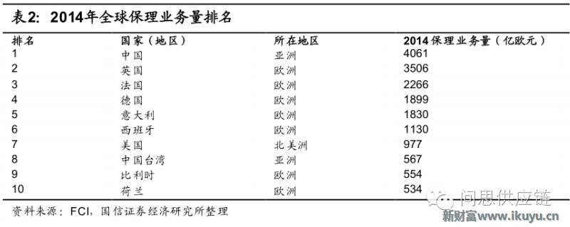 保理起源于欧洲,欧洲也是目前全球保理业发展最为成熟、业务体量最大的区域市场。根据FCI提供的统计数据,2014年全球保理业务量排名前十的国家中有7个都是欧洲国家。