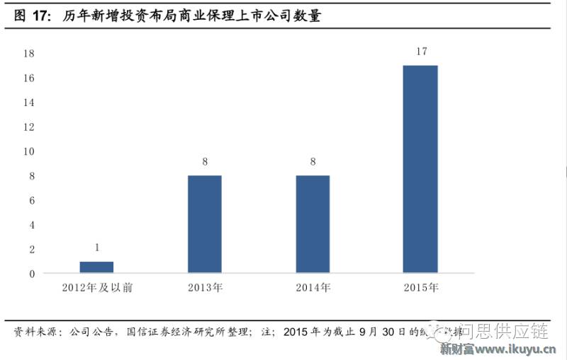 (3)政策支持与上市公司参与情况:政策春风不断,上市公司抢跑布局。前文已经在图8中列出我国政府自2009年以来对商业保理的各项支持政策,而预计年内将会出台的《商业保理企业管理办法》更会将政策支持力度提高到新的层面。在政策春风不断的背景下,我们发现2012年以来已经先后有34家先知先觉的上市公司(包含在沪深股市、香港股市及美国纳斯达克市场上市的所有中国公司)开始布局商业保理,抢跑供应链金融蓝海市场以期获得先发优势。是特别是2015年以来,止上市公司投资商业保理的热情激增,截止9月月30日增已新增17家境内外上市的中国公司投资布局商业保理,市场关注度正在快速升温。
