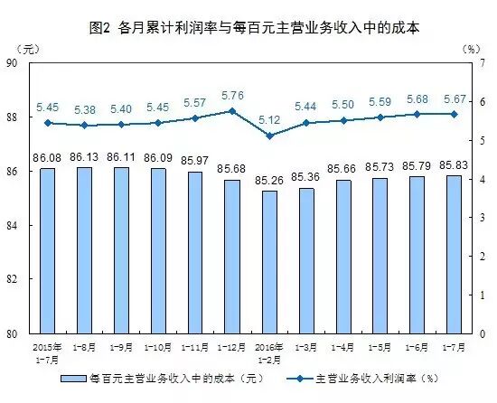 1-7月份,规模以上工业企业实现主营业务收入62.2万亿元,同比增长3.3%;发生主营业务成本53.4万亿元,增长3.1%;主营业务收入利润率为5.67%。