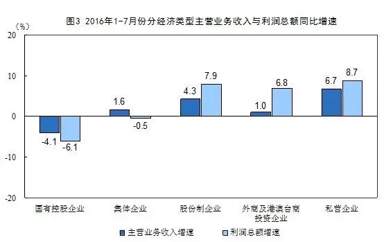 1-7月份,在规模以上工业企业中,国有控股企业实现利润总额6512.6亿元,同比下降6.1%;集体企业实现利润总额255.4亿元,下降0.5%;股份制企业实现利润总额24123.9亿元,增长7.9%;外商及港澳台商投资企业实现利润总额8748.6亿元,增长6.8%;私营企业实现利润总额12424.5亿元,增长8.7%。