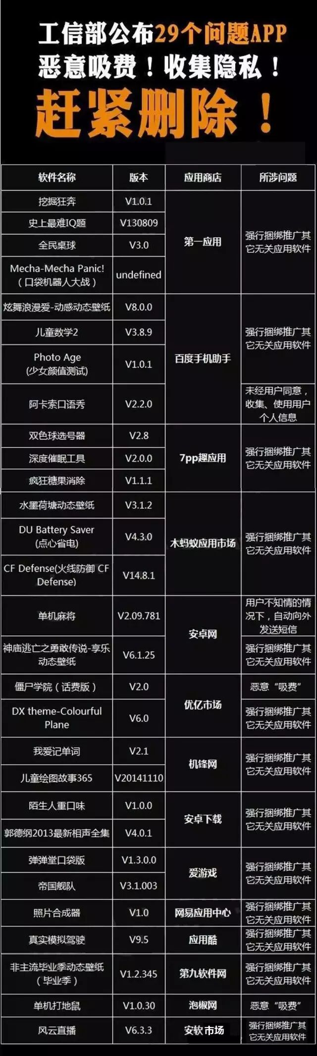 随着手机APP层出不穷的开发新产品,一些恶意APP软件也开始出现在应用商店中,它们能窃取信息、远程控制、传播垃圾消息等,严重影响了我们的生活。针对此问题,工信部出台了应用软件黑名单管理制度,对应用商店的软件进行严格管理,对恶意软件也起着重大的震慑作用。以下为工信部公布APP“黑榜”,如安装,请迅速卸载!