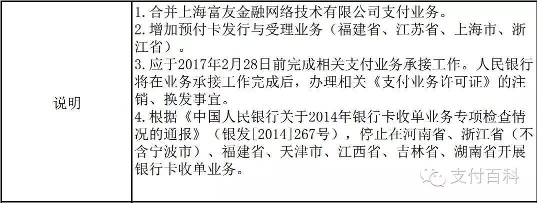 另外,山东鲁商一卡通支付有限公司和上海富友支付服务有限公司两家支付机构因为各自的业务合并事宜,央行暂未给出续展时间期限。央行要求,两家公司应于2017年2月28日前完成各自相关支付业务承接工作。人民银行将在业务承接工作完成后,办理相关《支付业务许可证》的注销、换发事宜。