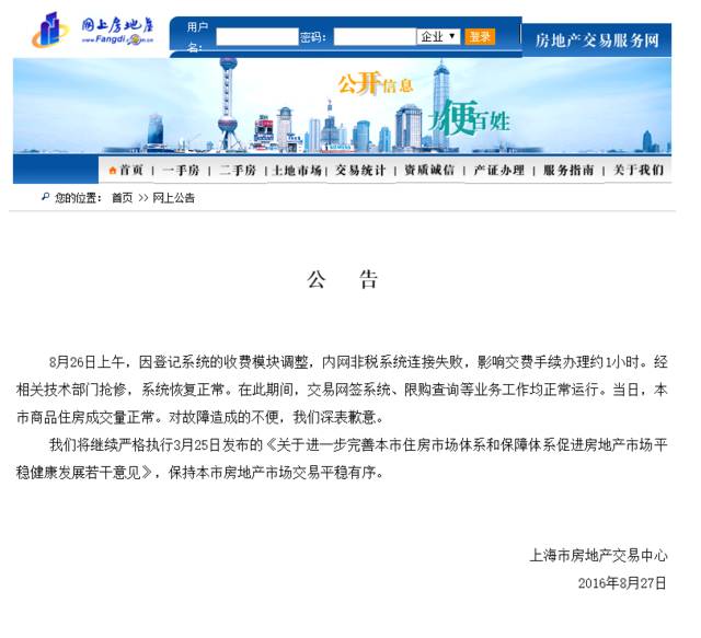 8月26日上海房地产交易中心网签系统故障