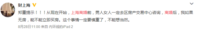 对此,微博知名财经博主@财上海 提醒:郑重提示!!!从现在开始,上海离婚前,男人女人一定去区房产交易中心咨询,离婚后,我如果无房,能不能立即买房。这个事情一定要慎重了,不能想当然。
