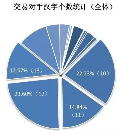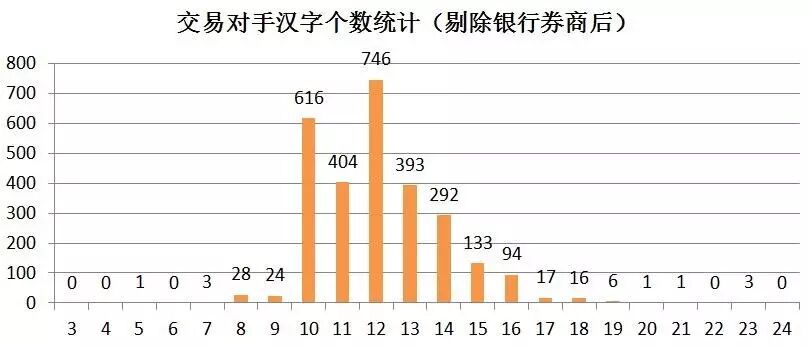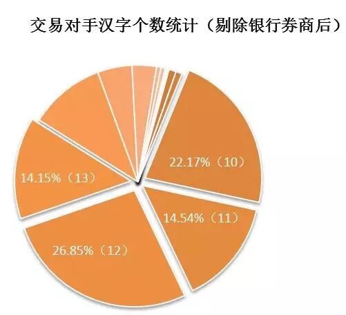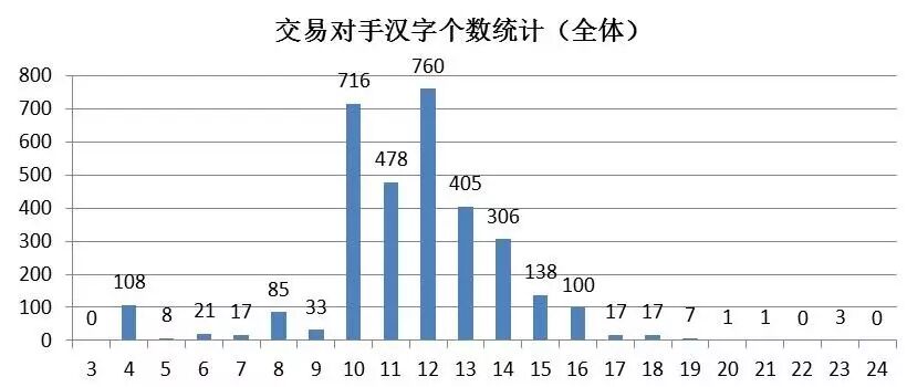 其次,笔者统计各个交易对手的名字长度。在全部交易对手中,名称最少的3个字,最多的23个字,分布呈现正态分布,其中占比最多的名称长度在10-13个,分别占比22.23%,14.84%,23.60%和12.57%,合计占比达73.24%。峰值为12个字,占比23.60%。