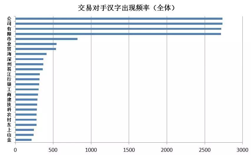 综上所述,该行交易对手名称长度介于10-13个字,高频字是市、贸、业、海、深、易、州、工、技等,根据以上结论,笔者大胆假设一个新的公司名称:深圳海工科技贸易有限公司,组合采用最带来好运的字,12个字长度完美匹配最佳频数,符合中文习惯。经工商企业查证,此公司名称尚未被注册。有机会哦——(本文内容仅代表作者个人观点,不代表其供职单位的立场)