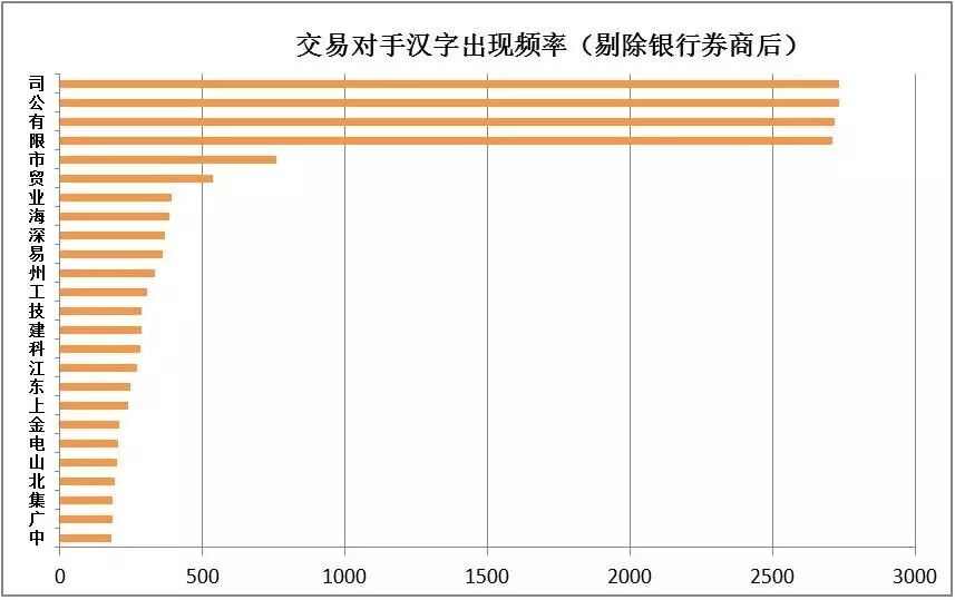 如图所示,除去“有限公司”常用尾缀外,常用的是市、业、贸、海、深、州、易、江等字眼。但是考虑到交易对手中存在大量的国股银行,农商行,农信社,证券公司,资管公司等信用等级较高的金融机构,故剔除主要金融机构443家,重新统计剩余实体企业2778家。笔者接着对民营企业进行进一步的名称分析。