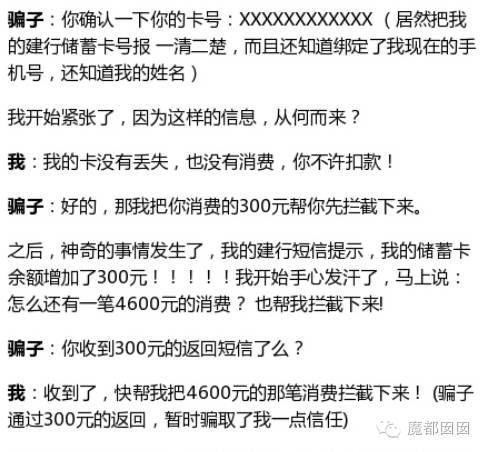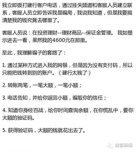 1、骗子进入了你的网银。 2、把你的钱转到你自己投资账户里,这是无需任何验证码和手续的,自己转自己而已(很多人不知道自己已经开了银行的投资理财功能,或者是银行默认开的?) 3、你转钱到投资理财账户的时候银行肯定会给你发信息,告诉你钱转出去了,这是正常的。但是仅仅是告诉你钱转出去的,转到哪里去了,银行并未告诉你!如果在这步银行多写几个字,写明转出去的目的地,这个骗术就很难成功了! 4、骗取你的信任!趁你方寸大乱的时候把银行的提示信息伪造成有人盗取你的网银下单,然后伪装成商家骗取你的信任,说要把钱还给你 5、把小额的钱从投资账户再转回你的网银账户。此时你自然会收到银行发给你的货真价实的存款信息。本来就是两个账户互相转嘛 6、骗取验证码。当你信以为真以为对方在帮你的时候。他就会提出另外一笔钱数额太大,需要验证码。而你收到验证码的时候,其实这时的验证码是骗子将你的钱骗走的验证码,一旦告诉他,彻底结束。