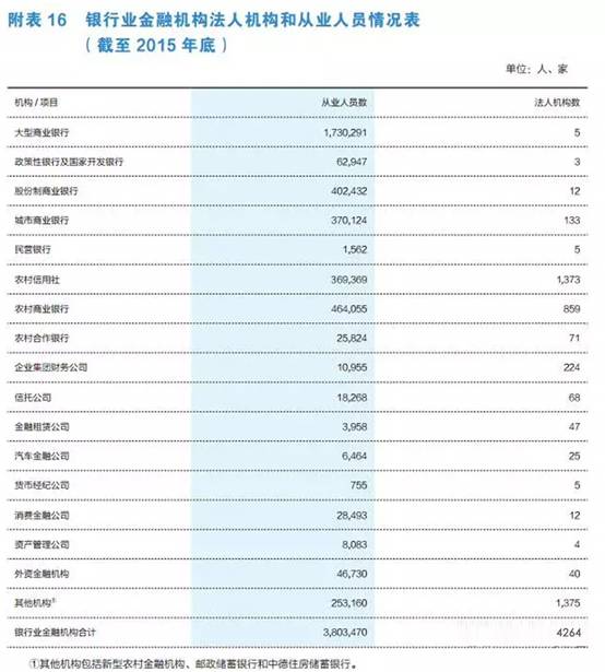 银监会发布《中国银行业监督管理委员会2015年报》,数据显示,截至 2015 年底,我国银行业金融机构共有法人机构 4262 家,从业人员约380 万人。