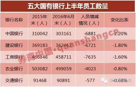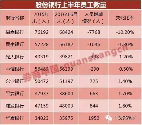 再看2016年上半年,多家银行员工人数已出现负增长。