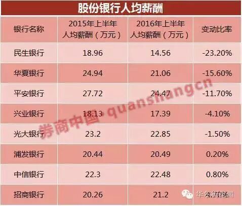 券商中国统计,16家上市银行中,多达10家银行人均薪酬出现不同程度的下滑,其中民生银行上半年人均薪酬同比下滑23.2%至14.6万元,无论是下滑幅度还是绝对金额,均位列上市银行第一位。