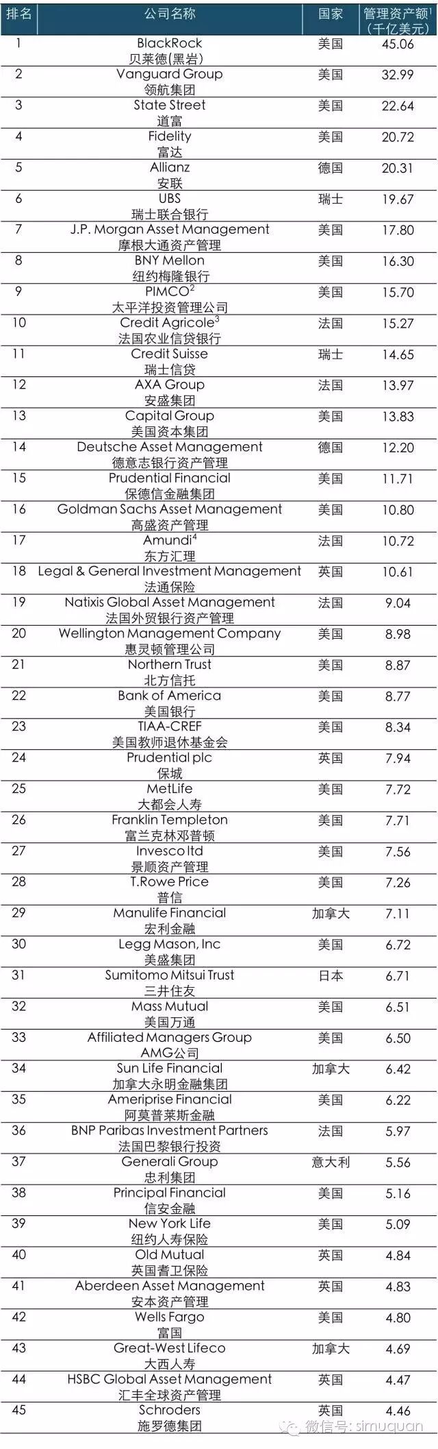 近期,牛交所研究团队统计了全球各大资产管理公司的资产管理规模(asset under management)。截至2015年底,全球资产管理规模最大的45家公司如下: