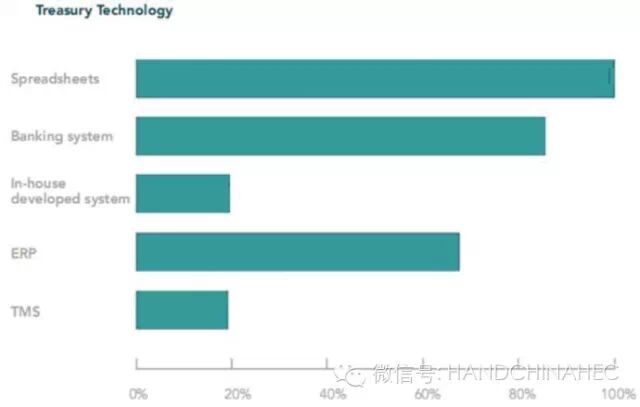 调查发现中国公司仍以人工方式或电子表格来操作绝大部分的财资工作。特别值得关注的是,如现金流预测(90%的公司以人工方式或使用电子表格执行该任务)、检查信用额度(100%)和银行对账(100%)。随着公司在全球范围内寻求增强控制、流动性管理和风险监控,使得这些领域的自动化与可审计性显得明显不足。