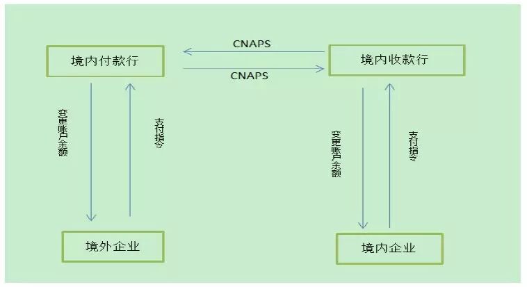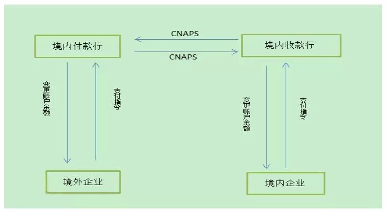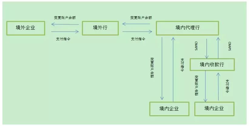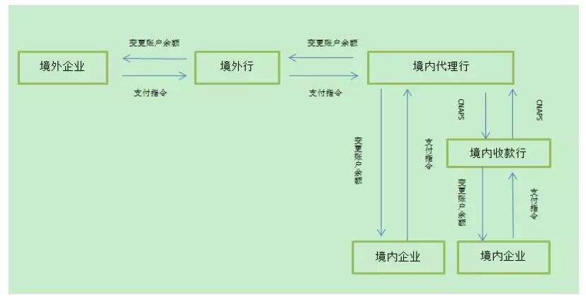 结算流程:出口时,花旗公司向安邦公司付款。则花旗公司向桑坦德银行发出支付指令,桑坦德银行收到指令核验无误后,变更花旗公司的账户余额,并通过所在国的支付系统向“工行马德里”付款。“工行马德里”收到付款核验无误后,由境内工行总行通过CNAPS向“建行北京”支付。“建行北京”收到付款后,变更安邦公司的账户余额。进口时,反向操作即可。
