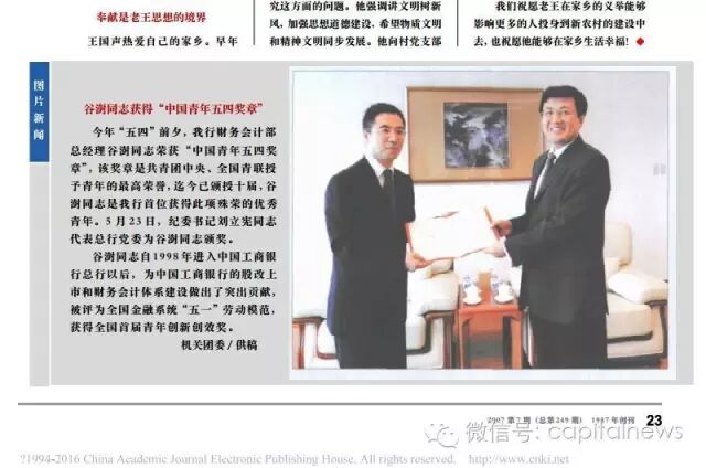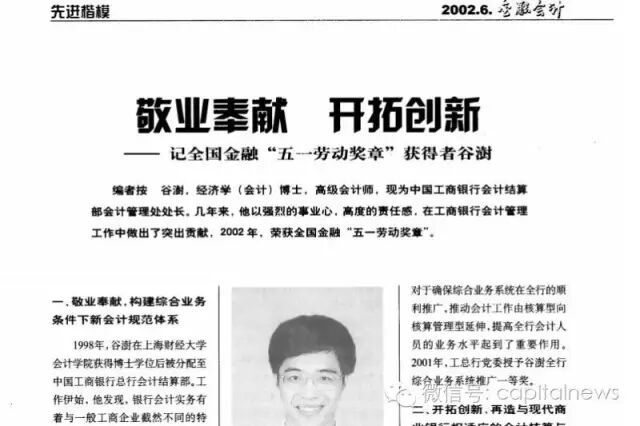 今天上午,中国工商银行总行新行长的任命书已经颁发,年仅49岁的谷澍成为全球最大商业银行最年轻的行长。 现在,百度上搜索“谷澍行长”一词,系统就已自动联想出“谷澍行长太牛了、太帅了”这样的关联词。啥情况? 长安街知事APP从工行总行独家获悉,这位新行长是一枚资深学霸:不仅首创了我国商业银行合并会计报表机制,还是业界学术权威杂志上发文的常客。他拿奖拿到手软,曾获得“全国青年五四奖章”,全国金融系统“五一”劳动奖章…… 左为谷澍 1998年,谷澍从上海财经大学毕业,被分配至中国工商银行总行会计结算部。他主动提出到一线网点锻炼,并来到北京分行玉泉路分理处,从基础的业务做起,一个岗位一个岗位地实习。 有了理论与实践的基础,回到总行后的他恰逢工行新一代综合业务系统开发完毕,即将开始试点。谷澍参与制定了这一系统下的新会计规范体系,主笔撰写了大量关键内容,这套新体系对全行会计业务的操作,核算,控制进行了全面规范,共计几十万字。2001年,工行总行党委授予谷澍全行综合业务系统推广一等奖。 说谷澍行长是会计领域的“大牛”,估计没人敢不服。长期起来,我国商业银行的会计报表一直是以汇总会计报表为主,谷澍曾在2001年组织编制了我国商业银行中第一套合并会计报表,使银行的财务状况、经营成果和现金流量状况得到了更准确充分的反映,标志着“宇宙行”在构建与现代商业银行相适应的会计核算与信息披露机制方面又向前迈进了一大步。 一提到银行,风险控制是一个逃不开的话题。谷行长曾主笔制定了《中国工商银行基层营业机构负责人管理办法》,通过双线控制、定期轮岗、离岗稽核等手段,加强对基层营业机构负责人的管理。 作为一位“宇宙行”的老人儿,谷行长在行内人气超高。长安街知事APP扫听了一圈,工行小伙伴们对他的印象可谓是五花八门。其中,传播最广泛的,是“处理危机的高手,资深的财务专家”以及...帅呆了,一位工行总行工作人员说,谷行长一直都是“温文尔雅,颇有学者风范”。 从今天上午开始,工行总行一位女员工的朋友圈就被同事们惊呼高颜值行长的感叹刷屏,年轻的同事们都是粉丝迷妹啊。 不过,管理好全球最大的商业银行,光靠颜值可不行。工行年报显示,2015年末该行营业收入6976.47亿元,同比增长5.9%;同期实现净利润 2777.20亿元,增长0.5%,营收增速和利润增速已明显下滑。在利率市场化、金融及技术脱媒的冲击、不良贷款攀升等挑战显现并加剧的大背景下,如何带领工行稳健“回暖”,是摆在谷澍面前的新课题。谷澍不到50岁还很年轻,在很多人看来,任用他当行长,基本确定了下一个十年工行的安排。