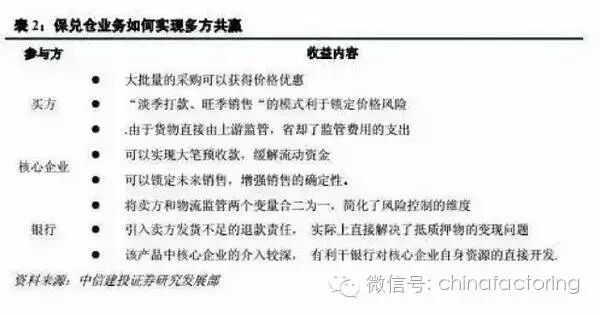 保兑仓是基于特殊贸易背景,如:1、客户为了取得大批量采购的析扣,采取一次性付款方式,而厂家因为排产问题无怯一次性发货;2、客户在淡季向上游打款,支持上游生产所需的流动资金,并锁定优惠的价格。然后在旺季分次提货用于销售;3、客户和上游都在异地,银行对在途物流和到货后的监控缺乏有效手段。保兑仓是一项可以让买方、核心企业和银行均收益的业务。
