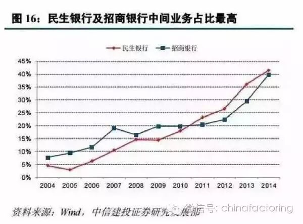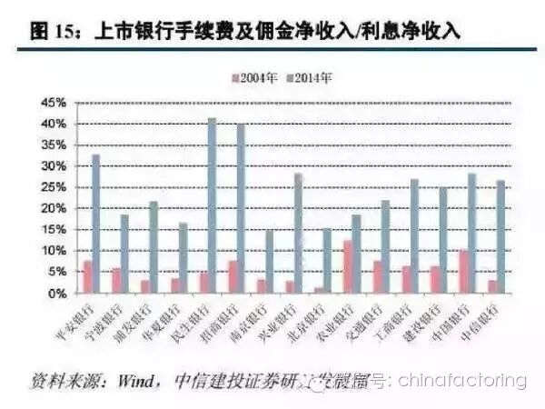 由于中间业务更能体现一家银行在金融科技服务、知识服务商的竞争力,上市银行手续费净收入和利息净收入的比值已从 10 年前的平均 6%提升到 14 年的平均 26%,民生和招商银行则超过了 40%,显现出金融服务技术的提升,然而相对于西方银行仍然偏低(14 年美国银行 60.8%、摩根大通119.4%、富国银行 80.7%)。