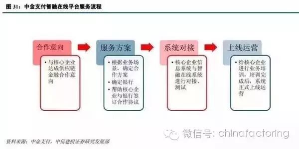 以中金支付的智融在线产品流程为例,首先与核心企业达成一个合作的意向,然后根据行业特点和业务场景,制作个性化方案。再根据核心企业的诉求,帮助其匹配资金方,三方探讨下形成合作协议。方案形成之后,平台进行系统对接,之后进行培训、上线。平台为不同的信息化建设水平的核心企业提供不同的方案。信息化水平高的企业平台直接提供接口,将产业链上的交易信息导入线上,上下游有融资需求的企业都可以在平台上发起融资请求;如果核心企业信息化水平较低,或者本身没有信息化系统,平台也可以为其提供系统支持。