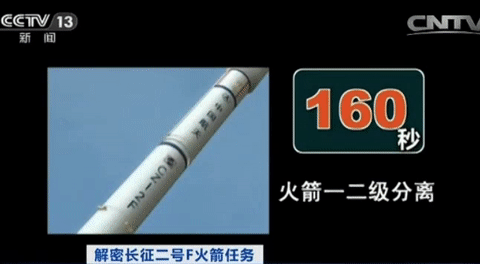 160秒,一级火箭燃料耗尽,一二级火箭分离,火箭二级发动机启动。