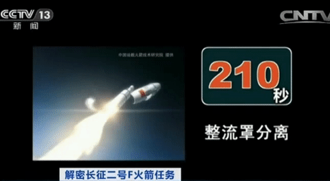 210秒,二级火箭带着天宫飞出大气层,保护航天器的顶部整流罩也结束了自己的使命,同样也要被火箭抛掉。