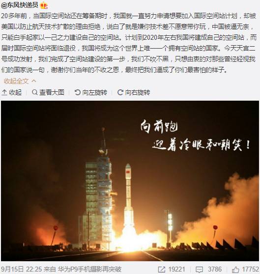 昨晚,天宫二号空间实验室在甘肃酒泉卫星发射中心发射成功,中国迈向空间站时代。微博上,@东风快递员 的一条博文,得到几万条转赞,文中写道: