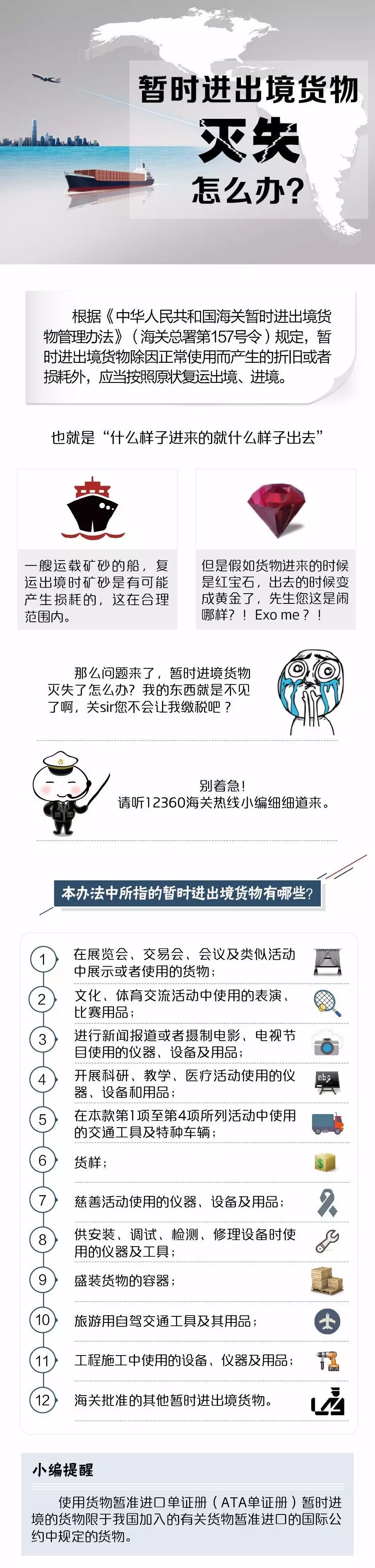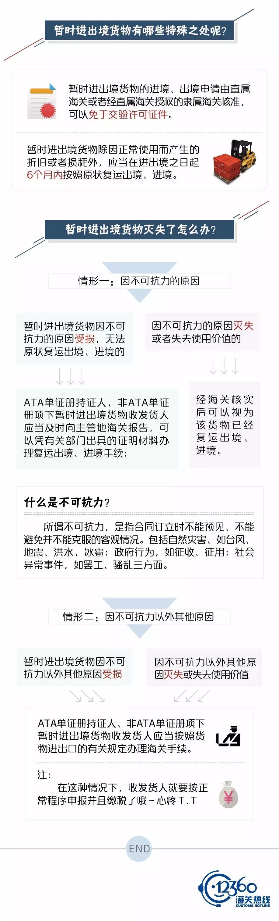 根据我国海关法规定,暂准进出境的货物须在6个月内按原状复运出境、进境。但是,倘若货物在未复运出/进境之前遭遇台风、冰雹而受损或灭失时,企