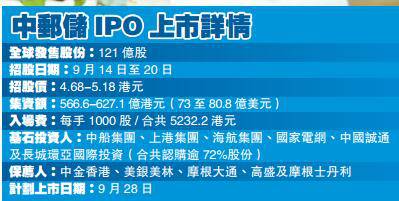 这次IPO,邮储银行一共引入6名基础投资者,共认购58.5亿美元股份,占总集资规模72%至80%。其中,中国船舶工业集团及上海国际港务集团,分别认购约34亿及33亿股股份,另外,还包括海航集团、国家电网、中国诚通及长城环亚国际投资,相关股份设有6个月禁售期。