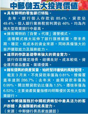 邮储银行拥有全国最多的营业网点,贷款质量也优于同行,不良贷款率是同业的一半,整体经营风格稳健。市场分析认为,邮储银行赴港上市,特别是在“深港通”进程加快的背景下,将给香港带来新的投资机会。同时,也有利于邮储银行补充资本金,加速该行商业化转型。
