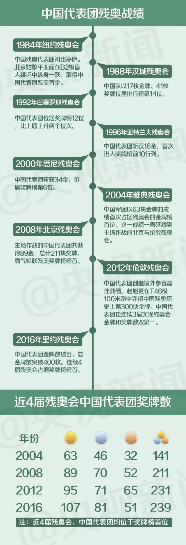 实际上,自2000年悉尼残奥会开始,中国代表团在每届残奥会上都不断创造金牌数和奖牌数的新纪录。特别值得一提的是,本届残奥会中国代表团在奖牌榜上蝉联榜首,中国已经是连续4届残奥会位居奖牌榜首位。