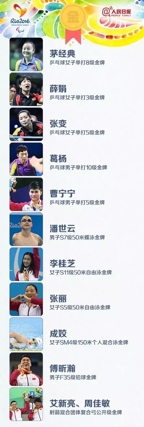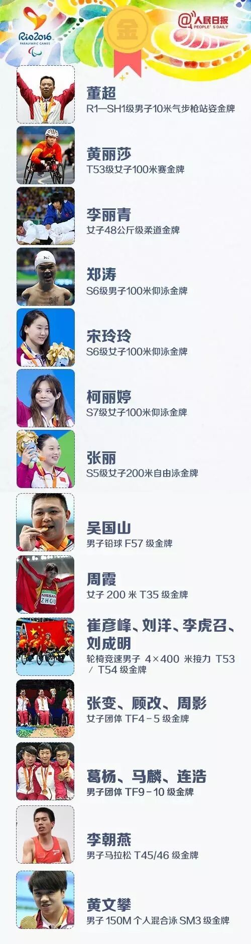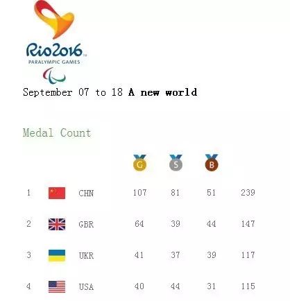 本届里约残奥会,中国军团发挥出色,共获得107枚金牌、81枚银牌以及51枚铜牌,共计239块奖牌,名列金牌榜和奖牌榜双第一,并成为单届残奥会上获得金牌数最多的国家。