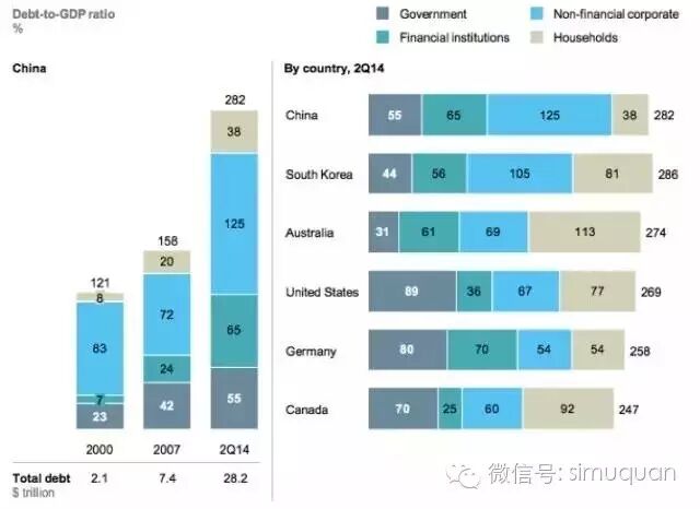 在2008年金融危机后,中国推出了“四万亿刺激计划”。在政府的鼓励下,银行大肆房贷、企业大量举债,导致债务/GDP比重从2007年的158%飙升至2014年的282%。更值得担心的是,中国的“非金融企业债务/GDP”高达125%,这一比例是全球主要经济体中最高的。根据标准普尔的数据,截至2013年年末,中国企业债余额为14.2万亿美元。相比之下,第一大经济体美国的企业债余额仅为13.1万亿美元。如果按照企业债务占GDP的比重来看,中国接近美国的2倍。