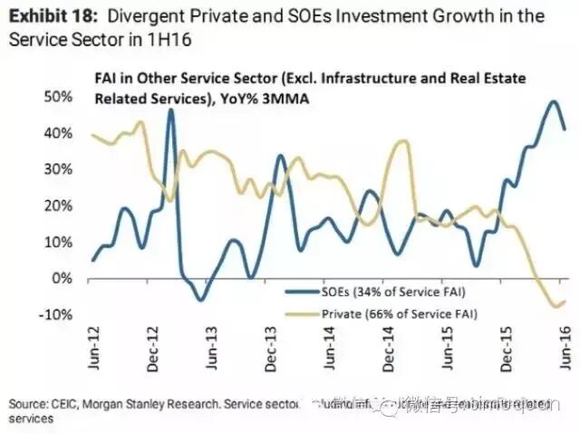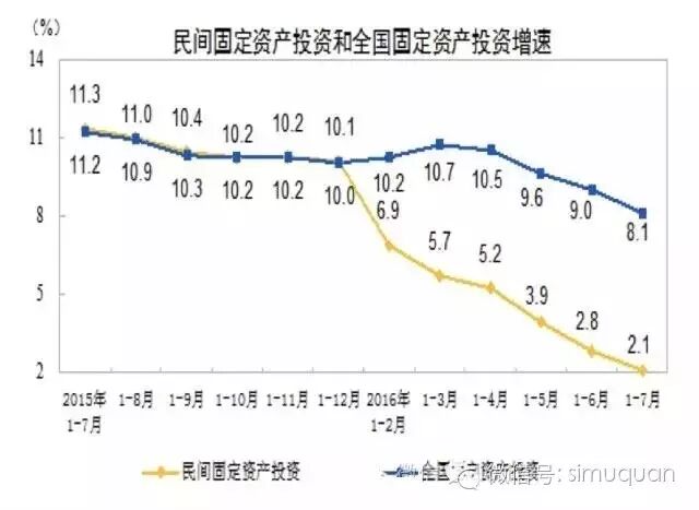 “新常态”进入2016年,一个新现象引发社会高度关注,国务院也紧急成立调查组进行调研:民间投资增速急剧放缓。在2015年,民间投资与全社会投资增速高度拟合,然而自2016年初开始两者拉开差距且呈逐步扩大趋势。1-7月民间投资增速2.1%,远低于全社会投资增速8.1%。民间投资与非民间投资的“背离”之所以值得关注,是因为:第一,民企贡献了60%以上的GDP;第二,政府和国企的投资不能真实反应经济“情绪”,只有民间投资才是最可靠的“信心指标”。