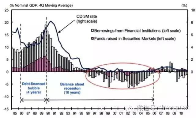 90年代日本泡沫经济破灭后,大量企业出现资不抵债,为“资产负债表衰退”提供了一个最佳案例:大约从1995年起,日本企业停止申请新的贷款,忙于偿债的日本企业数量持续增加。尽管利率几乎为零,日本企业仍以每年数十万亿日元的速度偿债。到1998年,企业部分已经变成净储蓄者。这就意味着企业不仅停止了从个人部分吸收投资,甚至还将自有资金用于偿债。至2000年,日本的企业储蓄已经超过了个人储蓄,在正常经济形势下本来应该是资金最大借贷方的企业现在变成了最大储蓄者。