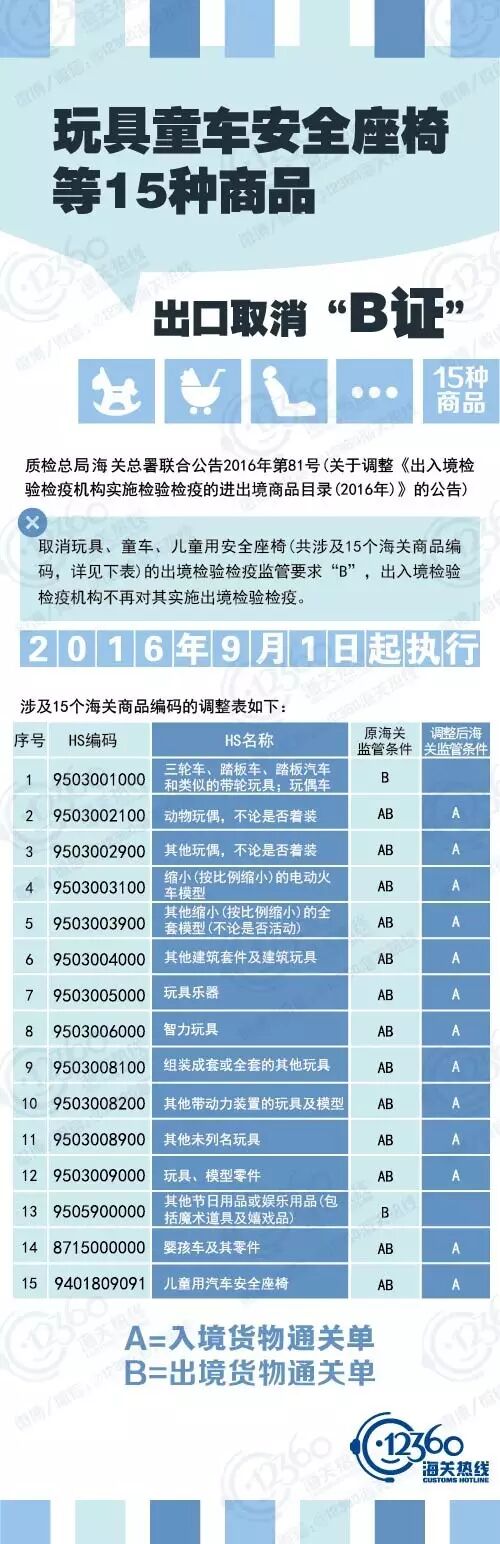 根据质检总局 海关总署联合公告2016年第81号规定,自2016年9月1日起,取消玩具、童车、儿童用安全座椅的出境检验检疫监管要求“B”,都涉及哪15个海关商品编码?快来看看吧~
