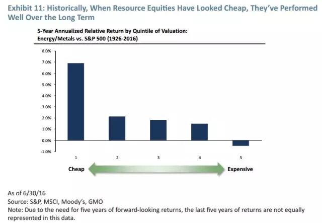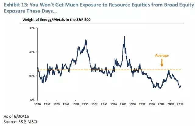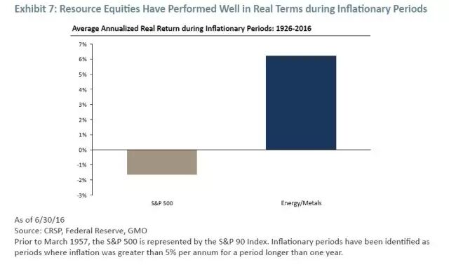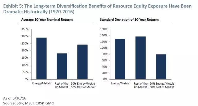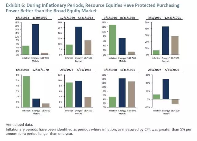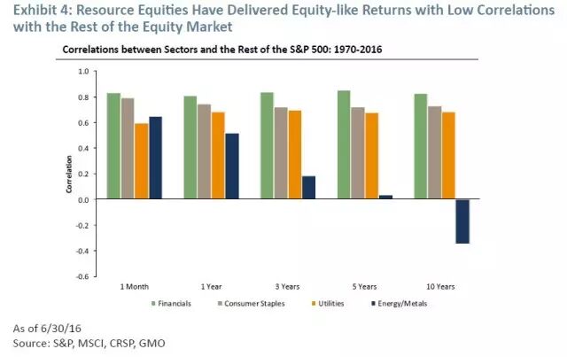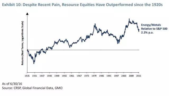 摘要 由于需求增长,以及廉价资源的供应有限,我们认为,未来数十年中,许多大宗商品的价格将会上涨。 通过公开发行的股票参与大宗商品投资是个好方式,允许投资者: -以低成本、高流动性的方式参与大宗商品投资 -获得股权风险溢价 -避免伴随期货合约移仓而来的负收益。 资源股可以提供独立于大盘的多元化投资机会,随着投资期限的延长,多元化配置的好处会逐渐体现。 历史上看,资源股不仅能对冲通胀,而且实际上在大部分通胀时期,其购买力还显著增强。 由于充斥着不确定性,以及大宗商品价格十分波动,许多投资者对资源股避之不及。因此,资源股通常都是折价交易的,而历史上它们一直是跑赢大盘的。 尽管资源股价格波动剧烈,并且短期可能大幅下跌,但是以更长的期限来衡量,资源股实际上一直是表现卓越的安全资产。 用某些估值体系来衡量,整个2015年和2016上半年,资源股看起来都非常便宜,这可能是未来它们会有良好表现的好兆头。 鉴于预测大宗商品价格非常困难,资源股过去一年半的低估值或是难以服众的。 即便如此,投资者通常不会持有太多资源股的敞口。比较典型的是,他们不会有针对地大比例配置资源股,同时大盘指数对资源股的敞口也不会很高。过去几年中,能源和金属公司在标普500指数所占权重下降了超过50%,MSCI全球指数也是如此。以价值投资为导向的投资者尤其可能低配了资源股,因为价值投资经理人对于大宗商品投资带来的风险总是特别厌恶。 引入 Jeremy 浓墨重彩地描绘了自然资源的长期前景,但其实除了价格上涨之外,投资大宗商品还有其他好处,包括多元化投资和对冲通胀风险等。 资源股是持有大宗商品敞口的好工具,同时还有机会获取股权风险溢价。天生的双重属性——一只脚踏在股市,另一只脚踏在大宗商品市场——让资源股呈现出一些非常独特的特征。 在不同的时间尺度中,资源股可能更多地跟着股市大盘走,也可能更多地跟着大宗商品市场走,其风险可能时而高于大盘,时而低于大盘。或许正是由于独立特行,资源股通常不受投资者待见,可能还会被误解。然而我们认为,无论是战略上还是战术上,资源股都意味着难以拒绝的投资机会,长期投资者可以从提高资源股的配置比例中获益。 为什么通过股票参与大宗商品投资? 股权风险溢价是关键 股权风险溢价是我们倾向于从股票市场而非其他途径参与大宗商品投资的主要原因。如图1所示,尽管1920年代以来油价的年化涨幅(实际价格,剔除通胀)微乎其微,但油气公司的实际年化回报率却超过了8%。这是非常健康的股权风险溢价。类似地,工业金属矿商股票也跑赢了各自资源品的表现(图2)。历史上看,股票市场显然是远比直接投资大宗商品更好的选择,这还没算上储存、运输、腐蚀等伴随直接投资大宗商品而来的费用呢。 大宗商品期货的问题 许多投资者通过期货市场参与大宗商品投资。然而,期货投资者必须与移仓损益作斗争,即他们需要平掉到期的合约,同时买入更长期限的合约。当期货价格曲线处于升水结构,或者说上翘时,卖出低价的近月合约并买入价格更高的远月合约就是一种负担。“低卖高买”通常不会是靠谱的投资实践,过去大约十年的经验显示,投资者面临的移仓环境并不是很好。 以彭博大宗商品现货指数为例,自2000年以来大宗商品价格上涨了近200%。然而,这只是一个理论回报率,其反映的是,在不发生与实物大宗商品交易相关的费用的情况下,你以(最初的)即期价格买入并持有至今可获得的收益。可以交易的是彭博商品指数,覆盖了和彭博大宗商品现货指数同样的大宗商品篮子,并且是通过期货市场进行交易的。如图3所示,以期货的方式进行投资“吃掉”了大宗商品现货几乎全部的收益。 股票的额外好处 股权风险溢价和期货移仓损益是促使我们转向股票的两个主要因素,但其实股票还有额外的好处。上市公司股票流动性通常比较好,而且交易费用低廉,同时股票市场还能将自然资源投资以各种各样的组合的形式呈现。此外,具备资源股的估值和选股能力可以带来额外的收益。 那么私募股权投资呢? 私募股权与上市公司股票有着许多相似之处,如果你愿意支付高额的费用,并承担较差的流动性,那么它看似一个合理的备择投资。但是我们不愿意!让私募股权投资变得更加复杂的是,行业中鱼龙混杂,发现少数几位真正能增加公司价值的私募股权基金经理人可能是十分困难和旷日持久的。而且,好的私募股权基金通常都不再接受新的投资了。 用高额的费用锁住投资的做法,以及通常无法增加公司实际价值的经理人,都让我们望而却步,尤其是一级市场投资还涉及透明度的问题。尽管在如今央行们极尽所能地支撑资产价格的世道下,不纠结流动性问题可能是司空见惯的做法,但是只要你回顾一下2008年就会意识到,当你真正需要它时,流动性是多么地重要。至少,上市资源股就像是对私募股权投资的极大补充。在我们看来,它应该在自然资源资产配置中扮演核心的角色。 投资资源股的战略意义 一直以来,大宗商品能够吸引投资者源于以下两个好处:多元化投资和对冲通胀。我们将简略地检验一下,资源股投资者是否享受到了这些好处,同时看看大宗商品股票投资的其他潜在战略益处。 投资多元化 让我们从资源股投资能否带来多元化开始。图4展示了不同时