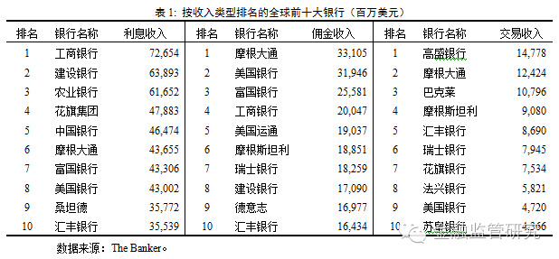 欧美银行在交易业务方面起步较早。英国《银行家》杂志对全球1000家大银行2014年经营收入类型的排名显示,中国的四大银行净利息收入规模排名全球前5位,但交易收入前10位完全由美欧大型银行垄断。其中,高盛银行的净交易收入达147.8亿美元,在所有银行中居首位,其交易收入占非息收入的比重达47%(见表1)。不同银行的交易收入来源各不相同,如汇丰控股的交易收入主要来源于环球银行及资金市场;摩根大通的交易型业务收入主要来源于机构及投资银行业务,包括衍生品交易、私人股权投资、做市、外汇等。