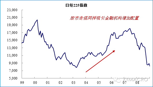 2)QE支撑风险偏好+经济复苏预期,推动机构增持权益类资产。日本金融机构资产配置的另一个特征是对股票资产增持明显。低利率和QE一方面压低了低风险资产的收益,另一方面也会刺激经济复苏预期,从而支撑风险偏好回升,这都会增大机构对股票资产的配置需求。