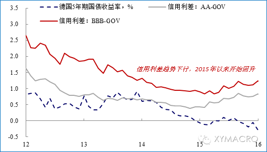 信用利差:整体趋势下行,但2015年以来开始走阔。在低利率期间,随着欧债危机的影响消退,欧元区信用利差整体呈现下降趋势。但随着2014年底以来的希腊事件升温、地缘政治事件、油价下跌等因素的困扰,欧元区经济风险出现上升,从而导致信用利差开始转而走阔。