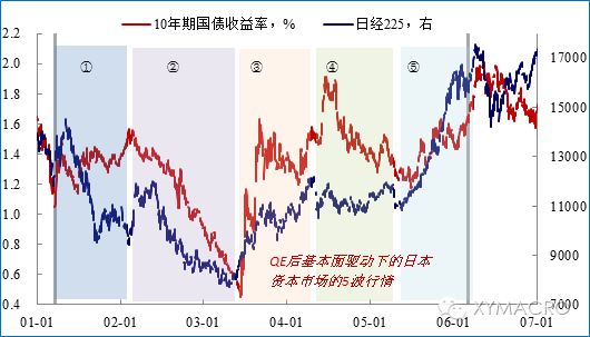 低利率期间日本股债的走势并非主要由流动性所驱动,而是受到国内外的事件和政策等因素驱动。我们认为,日本2001版QE期间资产表现可以大致分为五个阶段: