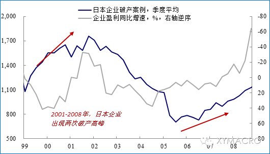 1)2001年前后,受网络泡沫破裂和国内经济衰退的影响,日本企业盈利快速恶化,企业破产风险上升;