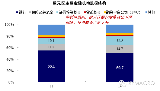 金融机构相对规模变化:银行占比下降,非银占比上升。与日本低利率阶段的特征类似,欧元区低利率时期,由于受到前期欧债危机影响和实体需求疲软,银行部门相对规模占比从2011年的55.1%降至2014年的50.7%,而保险、基金等非银机构占比明显提升,分别从11.8%、10.1%上升至14.7%、15.3%。