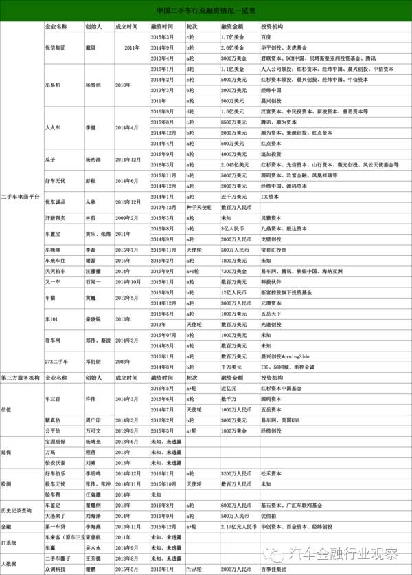 其中,获融资最多的二手车企业分别为:瓜子、优信、人人车、车易拍、车猫、天天拍车、好车无忧、车置宝、车三百等。