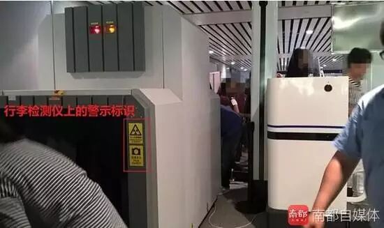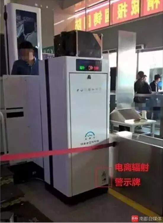 在仪器侧面有“当心电离辐射”的警示标识,在机场大门口的告示也提醒乘客,每次检查安检可能接受的辐射剂量“相当于乘坐飞机在高空飞行三分钟”。