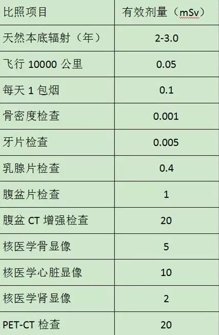 以吸烟者为例:如果每天1包烟,每年受到的辐射剂量约为35mSv,远大于大多数的医疗辐射剂量。再例如,一次X光检查,相当于坐飞机飞行2万公里。