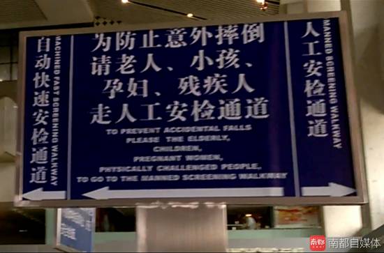 在过安检前会有一个告示牌,“为防止意外摔倒,老弱病残孕请走人工安检通道”,没有任何电离辐射的警示。车站工作人员也会引导孕妇和抱小孩的旅客走人工安检。(图片来自知乎网友 丧钟为我而鸣。)
