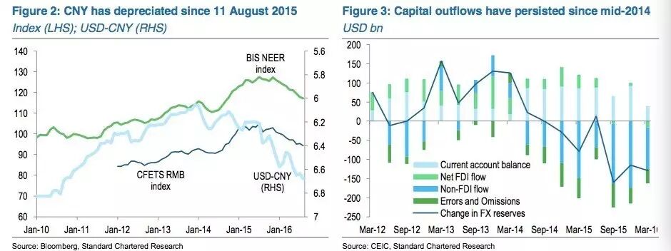 自2014年中期以来,资本外流的态势持续,刺激了进一步贬值的预期。渣打预计,中国央行在2014年初打破了人民币单边升值预期。到2014年5月后,资本外流的趋势便开始形成。2015年8月的人民币一次性贬值又加剧了这种预期。从中国的国际收支平衡表(BOP)来看,自从2014年三季度开始,资本外流(包含误差和遗漏项)已经几乎持续超过经常账户顺差,外汇储备也持续下降。